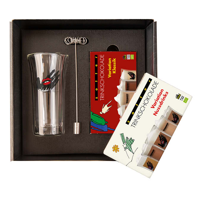 In diesem Trinkschokolade-Set stecken alle wichtigen Zutaten für die perfekte Trinkschoko-Zeremonie. Insgesamt zehn Sorten Trinkschokolade zum genussvollen Ausprobieren, ein Trinkschokolade-Glas im Zotter-Design, sowie ein handgemachter Quirler finden sich in dem dekorativen Geschenkkarton wieder. Ein wunderschönes Geschenkset für Schoko-Liebhaber. Die zehn Sorten des Sets sind: