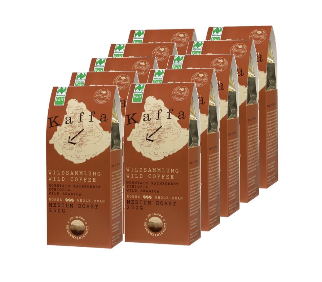 10er Sparset des fair gehandelten Kaffa Wildkaffees aus Äthiopien. Im Vergleich zum klassischen Kaffee stammen diese Kaffeebohnen nicht von einer Kaffeeplantage, sondern aus dem Regenwald. Seit Jahrtausenden wachsen dort wilde Arabica Bohnen und entwickeln ein individuelles, ursprüngliches Aroma. Wie gut gehegte Reben, die je nach Boden und Lage einen unterschiedlichen Wein hervorbringen, besitzen auch diese Kaffeebohnen je nach Anbaugebiet einen eigenen Charakter. Dieser Wildkaffee ist ein mittelstarker, gut verträglicher Kaffee mit außergewöhnlichen Geschmacksnuancen und gehaltvollem Grundton. Die Röstung der Kaffeebohnen erfolgt in langsamen Schritten mittels Trommelröstung bei ca. 200°C, wodurch eine Vielzahl an Aromen in der Kaffeebohne entstehen. Kaffeeliebhaber erwartet ein unvergessliches Geschmackserlebnis.
