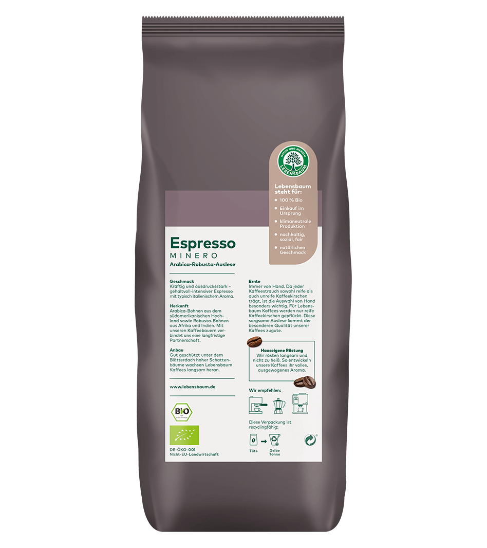 Kräftig und ausdrucksstark – gehaltvoll-intensiver Espresso mit typisch italienischem Aroma. Arabica-Bohnen aus dem südamerikanischen Hochland sowie Robusta-Bohnen aus Afrika und Indien finden den Weg in diese Espressomischung von Lebensbaum. Mit den Kaffeebauern verbindet Lebensbaum eine langfristige Partnerschaft, wodurch der biologische Anbau der Kaffeebohnen gefördert wird. Gut geschützt unter dem Blätterdach hoher Schattenbäume wachsen Lebensbaum Kaffees langsam heran. Die Ernte erfolgt immer von Hand. Da jeder Kaffeestrauch sowohl reife als auch unreife Kaffeekirschen trägt, ist die Auswahl von Hand besonders wichtig. Für Lebensbaum Kaffees werden nur reife Kaffeekirschen gepflückt. Diese sorgsame Auslese kommt der besonderen Qualität der Lebensbaum Kaffees zugute. Durch die anschließende hauseinige Röstung, die langsam und bei niedrigen Temperaturen geschieht, entwickeln die Kaffeebohnen ihr volles, ausgewogenes Aroma.
