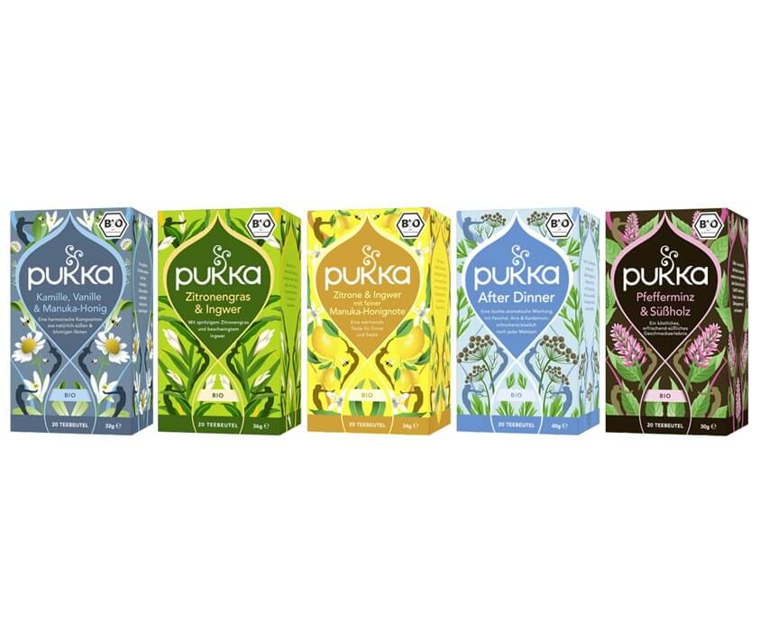 Die lebendige Tee-Mischung lädt zum Probieren ein. In dieser Auswahl steckt pure Tee-Vielfalt mit einem genussvoll-lebendigen Charakter, die besondere Geschmackserlebnisse parat hält. Mit dabei sind die Pukka Teesorten Zitronengras & Ingwer, Kamille-Vanille-Manukahonig, Zitrone-Ingwer-Manukahonig, After Dinner sowie der erfrischende Pfefferminz & Süßholz Tee. Begeben Sie sich auf Entdeckungsreise und lernen Sie die Vielfalt exotischer Kräutertees zum Vorteilspreis kennen.