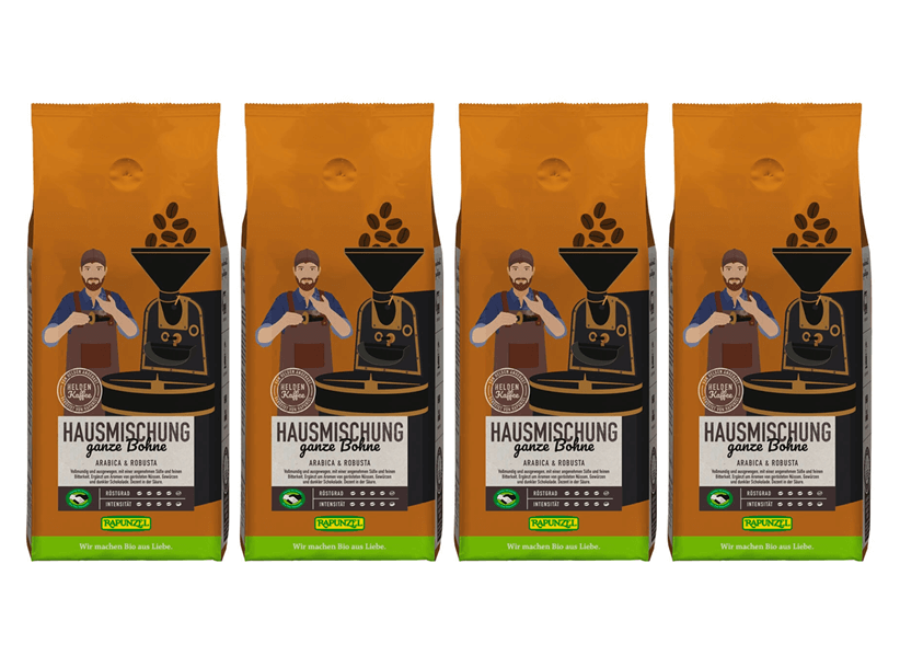 Der Heldenkaffee im günstigen 4er Set - In der Rapunzel Hausmischung findet sich eine aromatische Kombination von Arabica- und Robusta-Bohnen von Fairtrade Partnern aus Peru, Honduras und Tansania. Die Bohnen werden in der Rapunzel Kaffee-Rösterei geröstet. Die erfahrenen Röstmeister achten auf die hohe Qualität der Rohkaffeebohnen und sorgen dafür, dass für jede Bohne und jede Herkunft die richtige Röstzeit und Rösttemperatur gefunden wird. Geröstet wird im schonenden Langzeitverfahren bei niedrigen Temperaturen in einem traditionellen Trommelröster. Dadurch hat der Kaffee Zeit, die große Vielfalt seiner Aromen zu entfalten. Das Ergebnis ist ein vollmundiger und ausgewogener Kaffee mit einer angenehmen Süße und feiner Bitterkeit. Ergänzt um Aromen von gerösteten Nüssen, Gewürzen und dunkler Schokolade mit einer dezenten Säure.