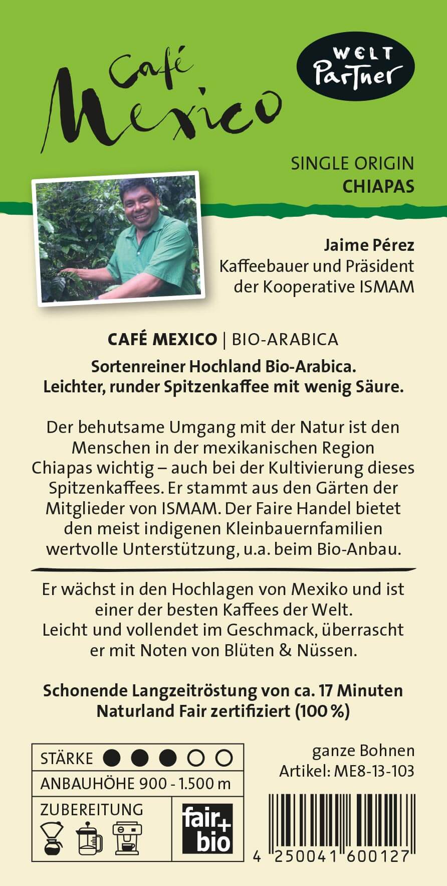 Ein naturmilder Hochland-Arabica mit wenig Säure steckt in dem Weltpartner Café Mexico aus der Region Chiapas. Die Anbauhöhe der Arabica-Bohnen liegt zwischen 900 und 1.500m wodurch die Bohnen langsamer reifen und somit ein intensiveres Aroma entwickeln. Leicht und vollendet im Geschmack überrascht er mit Noten von Blüten und Nüssen. Die schonende, milde Langzeitröstung von ca. 17 Minuten sorgt dafür dass sich das Kaffeearoma besonders gut entfalten kann. Zum Vergleich: Die industrielle Röstung dauert in der Regel nur zwei bis drei Minuten. Der Bohnenkaffee in der 500g Packung eignet sich hervorragend für die Zubereitung mit einem Kaffeevollautomat.
