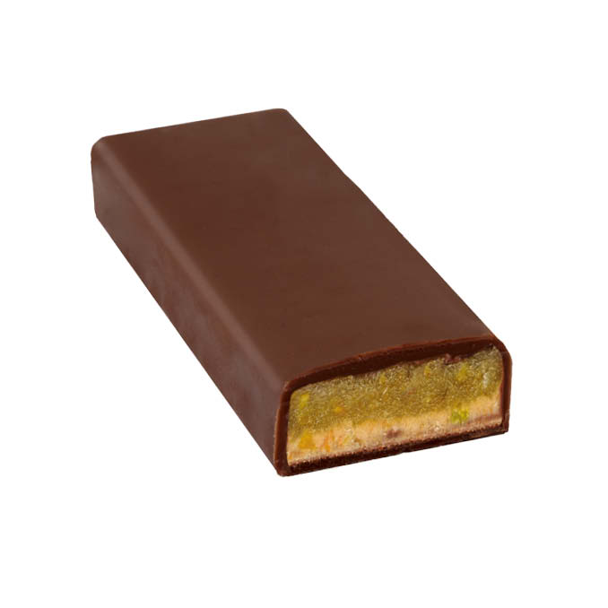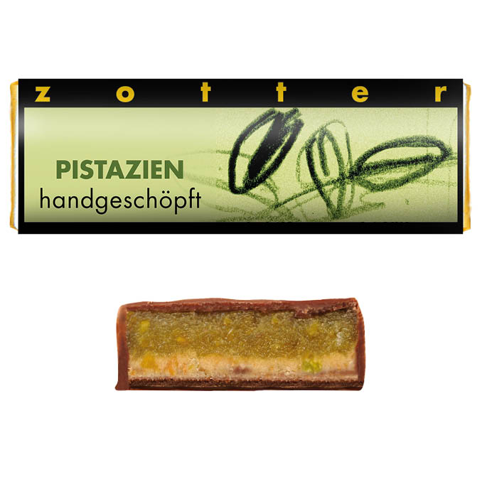 Zotter Schokolade handgeschöpft, Mini-Tafel Pistazien. Überraschend für die meisten, aber die Pistazien kommen tatsächlich aus dem Iran. Und in dieser Schokolade gibt es gleich die doppelte Portion. Zum Einen ein Pistazienmarzipan mit Anistee, und als zweite Schicht Mandelnougat mit Pistaziensprenkeln. Umhüllt ist das ganze von dunkler Bergmilchschokolade. Eine Mischung, die süchtig machen kann. Die Mini-Tafel ist perfekt zum Probieren und Verschenken.